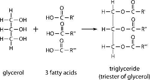 Triacylglycerols (TAG) is an ester derived from glycerol and three fatty acids as illustrated in Figure 2. Not only serves as energy storage, TAG or commonly known as body fat is use as body insulation in human and animal. Chemically, its melting temperature reflect their composition. As the chain length increase, molecular weight also increases resulting in increasing melting point. Besides, saturated chain has higher melting point than unsaturated chain.