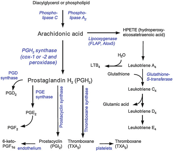 Eicosanoids are signalling molecules made by oxidation of arachidonic acid (or other polyunsaturated fatty acids that have 20 carbon units like arachidonic acid). Arachidonic acid is a polyunsaturated fatty acid and a type of omega-6 fatty acids. They can be either omega-6 fatty acids derived, or omega-3 fatty acids derived. The synthesized eicosanoids are not stored in body, instead they are directly used on site. Eicosanoids have complex control over bodily system such as inflammation and immunity. They also act as messenger in the central nervous system. They have roles towards the production of pain and fever, regulation of blood pressure, blood coagulation and reproduction. Eicosanoids are further classified under subfamilies; prostaglandins, prostacyclin, thromboxane and leukotrienes.